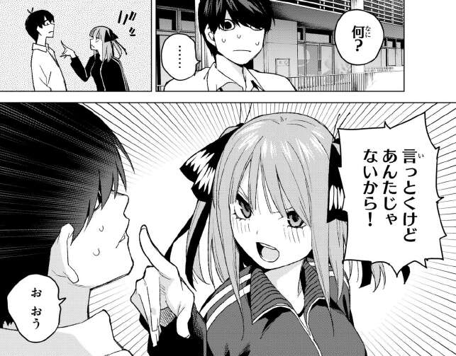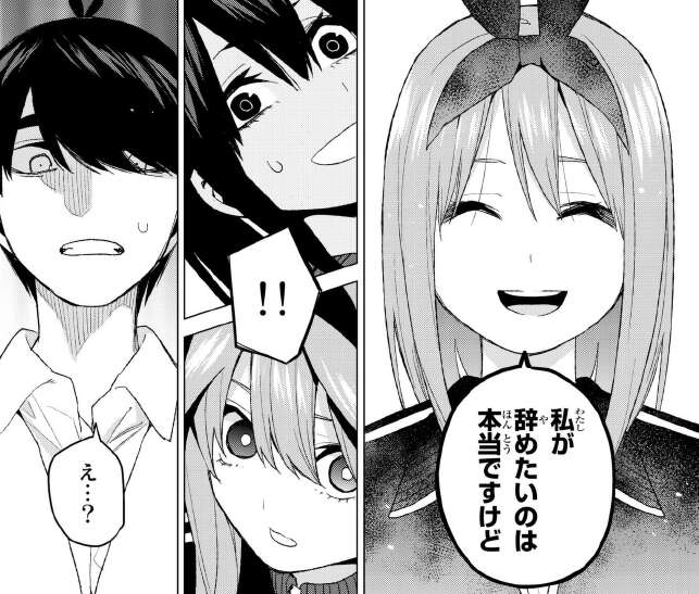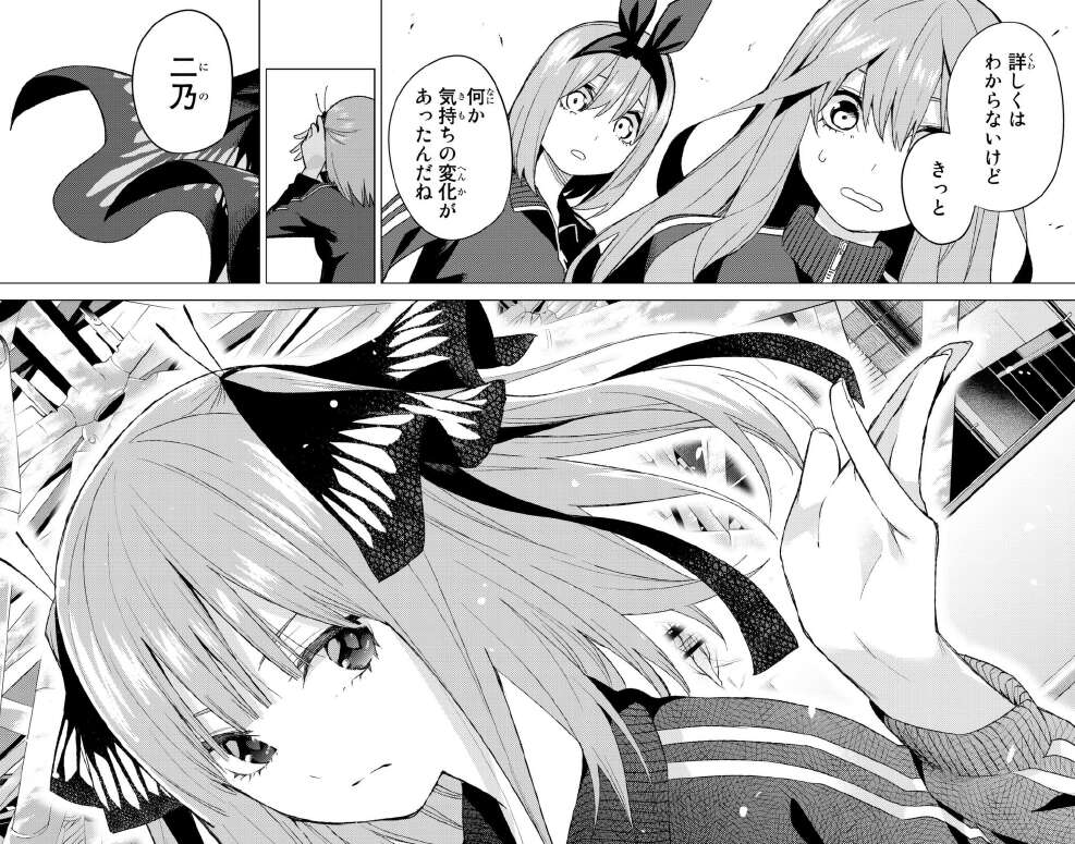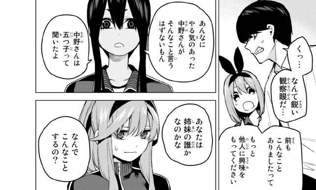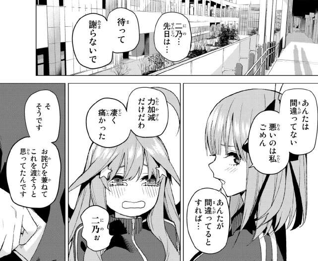 最後に今回、39話で喧嘩がエスカレートしてしまいぶつかりあってしまった二乃と五月ですが、五月が謝ろうとすると二乃は謝らないで、と言って自分から謝罪します。しかし五月にわざわざ、「あんたが間違っているとすれば…力加減だけだわ 凄く痛かった」と言っている辺り、五月のビンタはそうとう痛かったと推測できます。五月、馬鹿力?