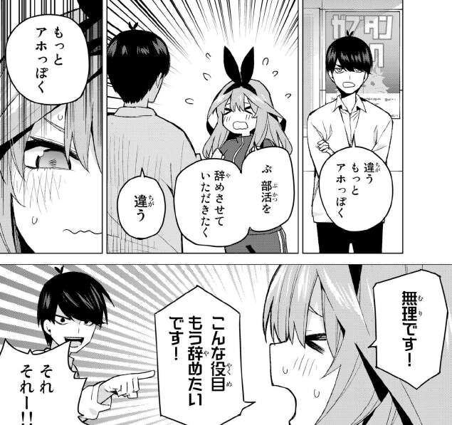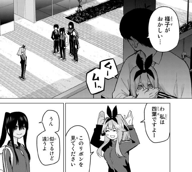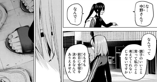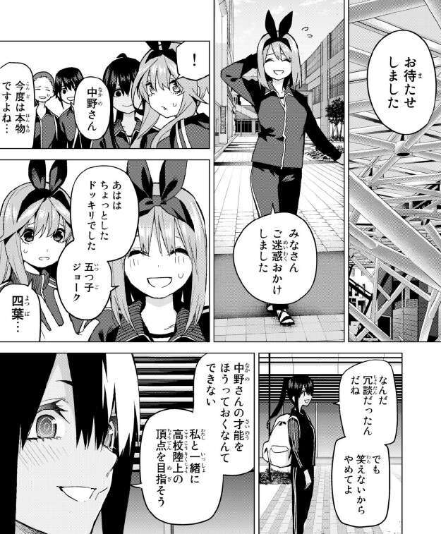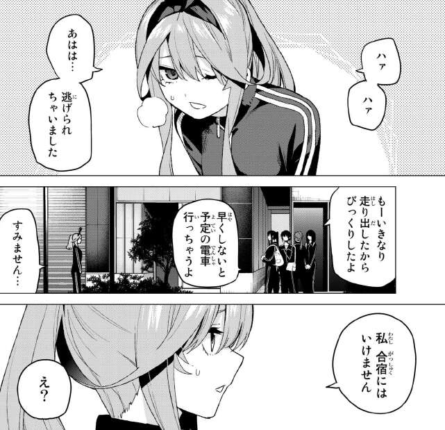 四葉が陸上部の部長に強引に誘われて合宿に連れて行かれるのを、風太郎と五つ子達は何とか止めようとします。