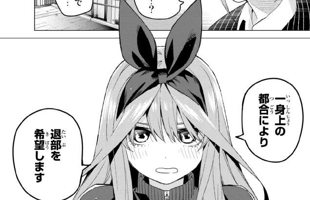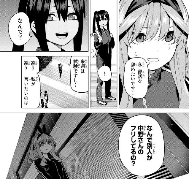 四葉の部活問題は、二乃の圧巻の気迫によって一蹴されました。二乃の気迫の前には陸上部の江場部長もビビりまくりです。さすが、二乃です。