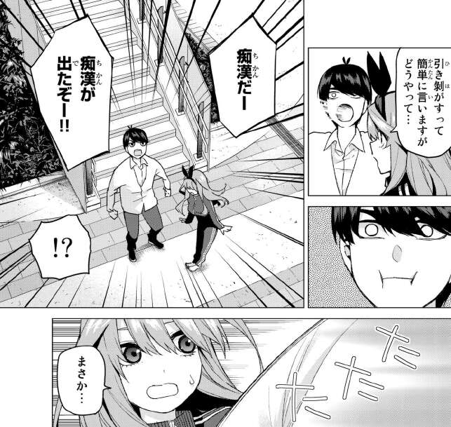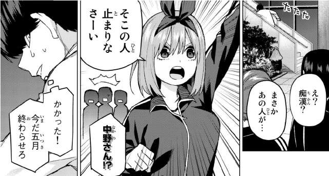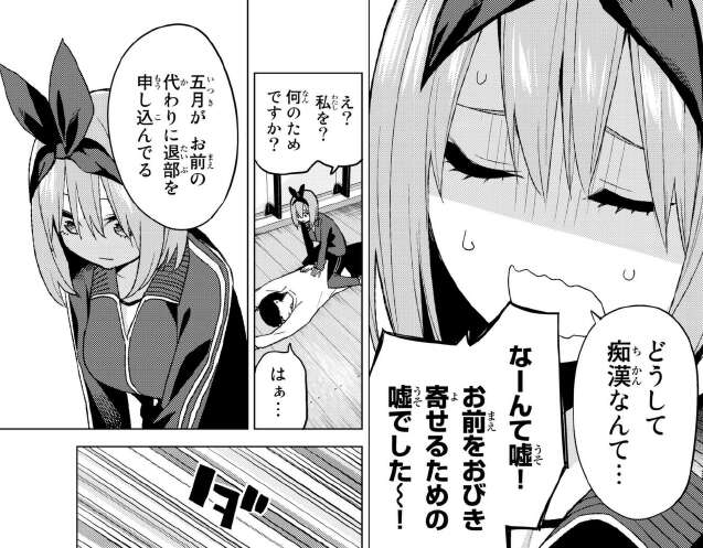 風太郎の作戦としては、風太郎が痴漢のふりをして四葉を引き寄せて、その後五月が陸上部と合流して、退部する作戦です。