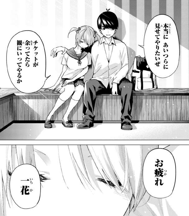 女優らしくなった一花にお疲れの言葉をかける風太郎ですが、一花は寝ていて聞いていなかったようです。