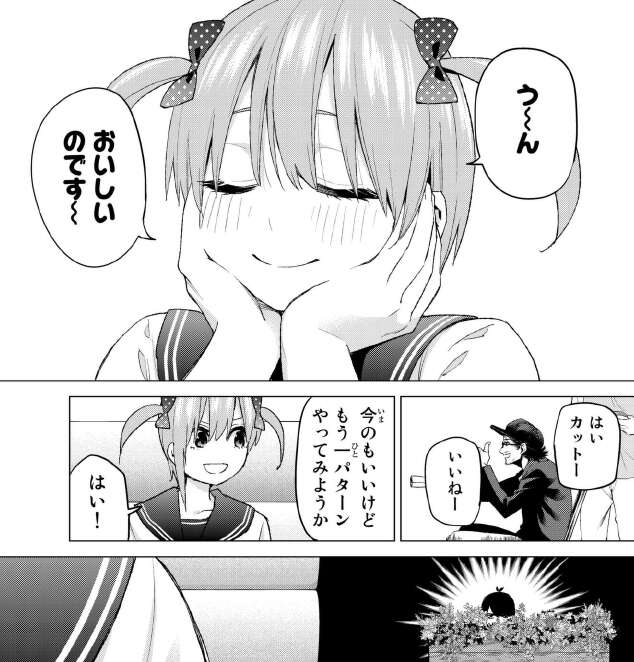 休憩の間に風太郎に見ないように頼む一花です。かなり恥ずかしいようで顔を真っ赤にしていますが、風太郎は恥ずかしがる役ならやらないように言います。しかし、食費や光熱費の為にどんな小さな仕事も引き付けると決めています。
