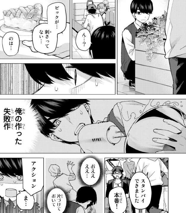 風太郎と目をあわせましたが、一花は見なかったことにしてやりすごします。五つ子たちが言っていた通り、一花は女優の仕事を続けていたようです。しかし、前回は居眠りをするぐらい私生活に影響が出ています。
