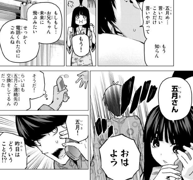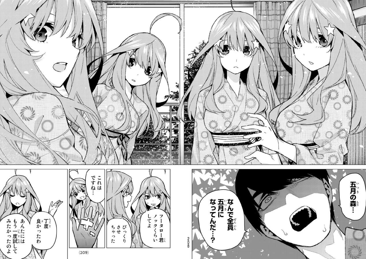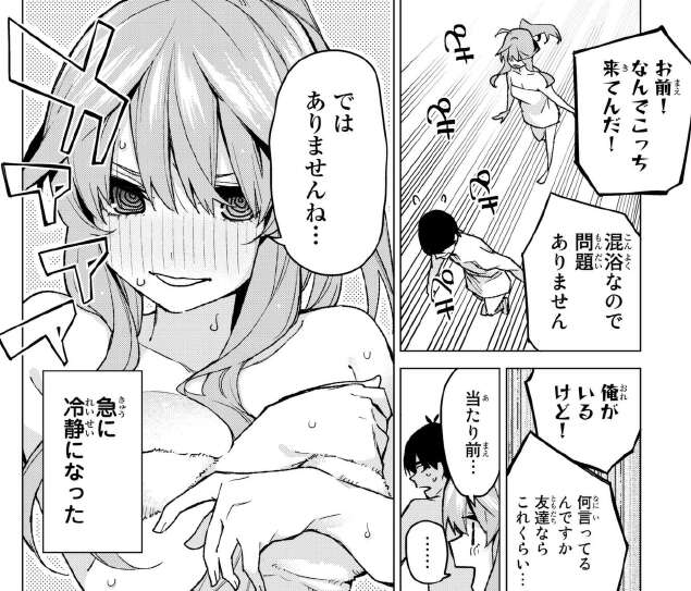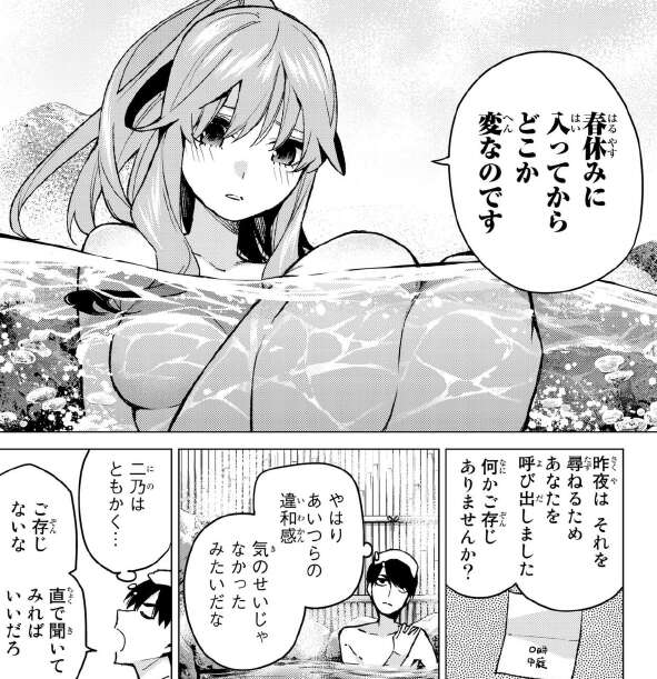 風太郎が指定したのは、混浴もある温泉でした。早速、父親の目が届かない温泉で昨日、五月から家庭教師を辞めるように促された事を確認します。やはり、五月はそんな事は言っていないようです。五月は自分のフリが出来るのは、他の四人しかあり得ないと言います。