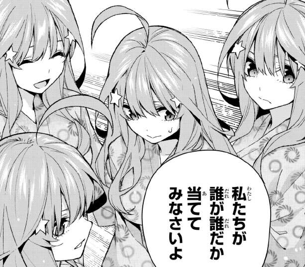 そして偽五月問題も大事ですが、五月に頼まれて他の四人の悩みを優先して解決しようとしますが、部屋に入ると五月だらけになっていて風太郎は誰が誰かを当てる事になりました。