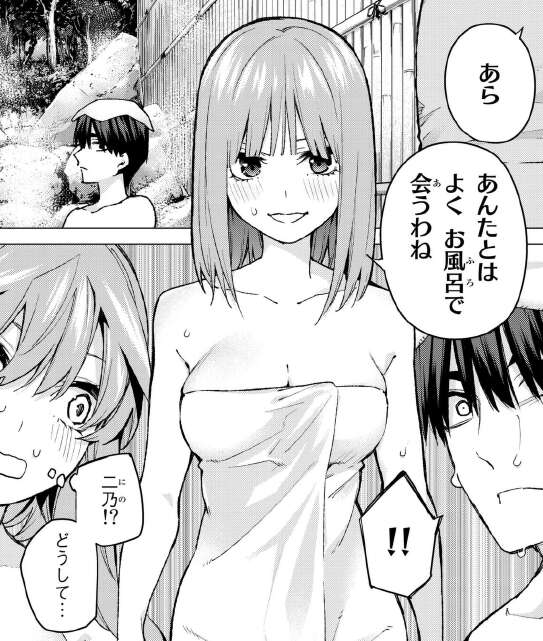 まさか風太郎が二乃と五月、二人と混浴できるとは。二人も大胆ですね。