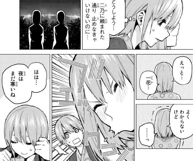 一花と四葉は屋根の上にあがっています。屋根の上からは父親が出ていくのが見えていて、一花は二乃との約束で足止めを思い出しますが、四葉がいるので出来ません。