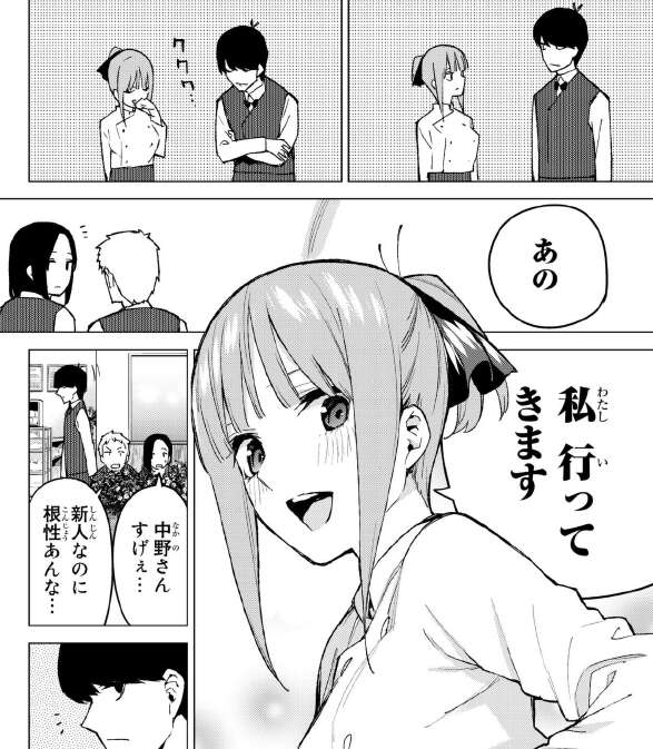 風太郎と二乃は全てを悟り、思わず笑ってしまいます。そして、他の従業員たちがオーダーの取りに行けず躊躇しているところに、「私 行ってきます」とオーダーを率先して、二乃が取りに行きます。すごい、と驚く他の従業員です。