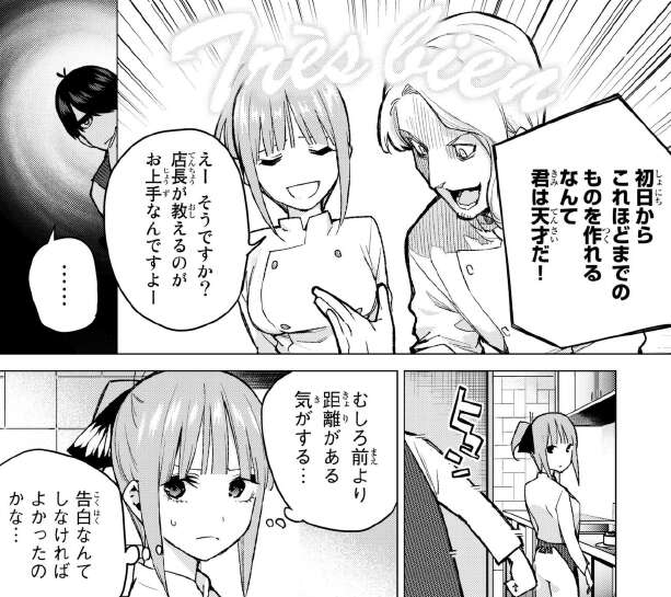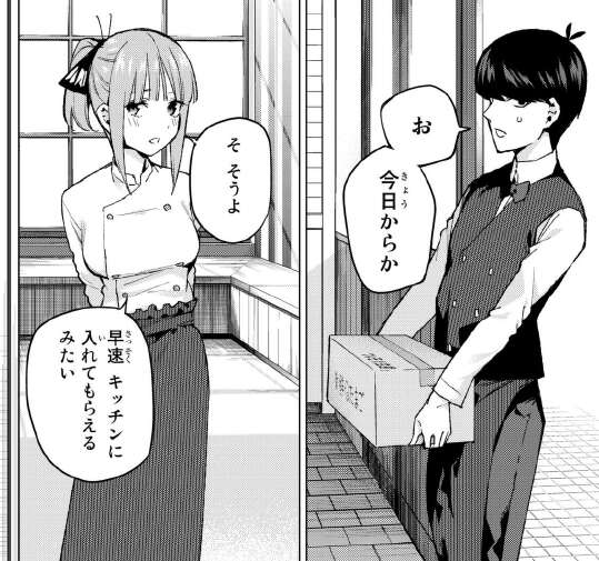 二乃はアルバイト先の一員と認められて、風太郎に少しでも近づこうと頑張りますが、味に違和感があると言われ作り直すことになります。二乃は頑張っていますが、頑張りが空回りしている感じです。
