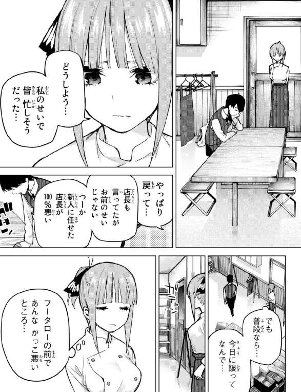 二乃はアルバイト先でも手際よくこなし店長からも絶賛されますが、風太郎と距離をおかれているように感じます。そして、今日お店に来るお客はこの界隈では知る人ぞ知る有名レビュアー「M・A・Y」という人で、店長はM・A・Yさんに気に入ってもらうため、気合を入れます。