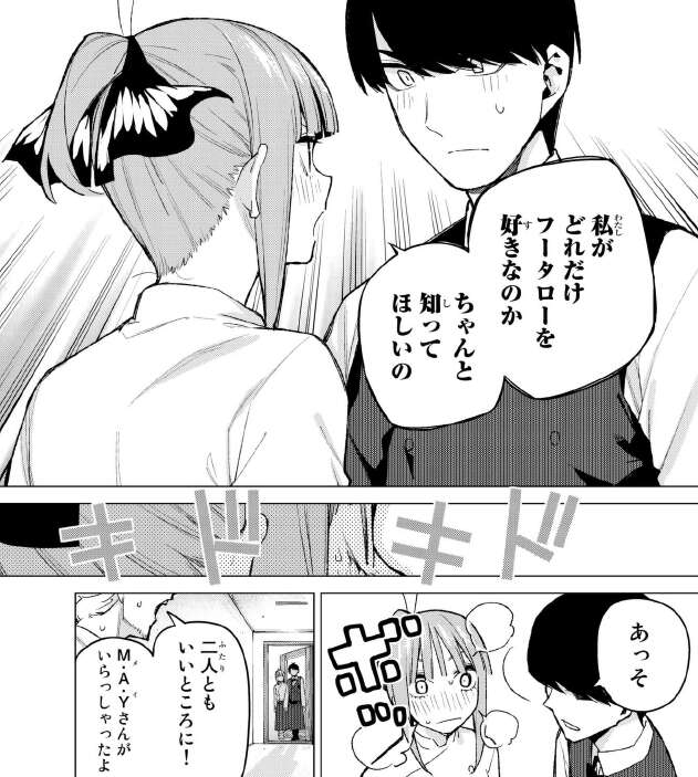 そしてこれまで勉強のことばかり考えてきたので、誰かに告白されたのは初めてで、どう話せばいいかわからなかったと言います。風太郎が意識していて、ぎこちなかっただけと知り、二乃は吹っ切れた様に「でもまだ決めないで」、「私がどれだけフータローを好きなのか」「ちゃんと知ってほしいの」と言います。