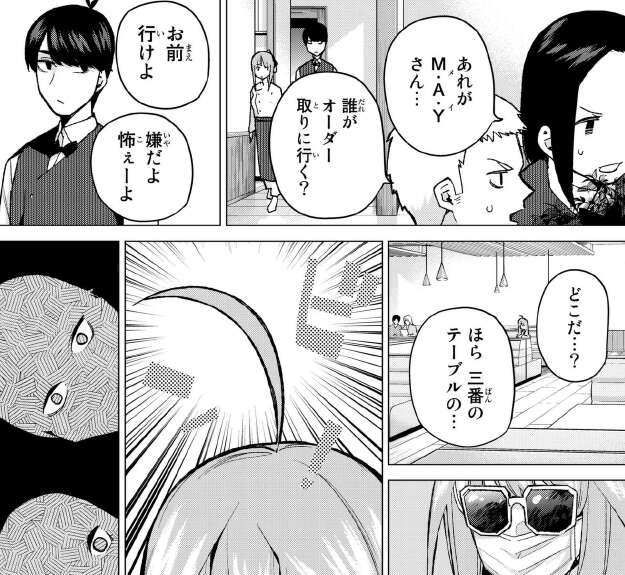 一方、アルバイト先に現れた「M・A・Y」さんですが、見覚えのあるアホ毛とサングラスに、マスクです。どうやら「M・A・Y」とは、五月が変装して風太郎達のアルバイト先に食べに来ていただけのようです。