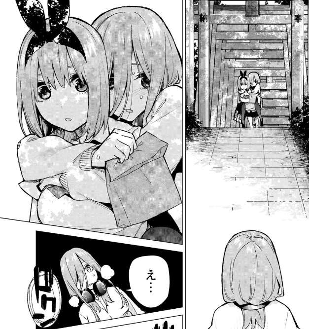 しかし、四葉はそんなつもりで言ったんじゃない、それが一花の本当にしたかったこと?と一花を責めます。四葉は三玖に、一花が邪魔をしようとしていると言い、ばらそうとしますが誰かが階段を上ってきている事に気付いた三玖一花は、四葉を止めようとします(追記:コメント欄で教えてもらいましたが、状況から見て三玖は階段を背にして登ってきている風太郎が見えない等の理由で、四葉を止めようとしたのは三玖ではなく、三玖に変装した一花の方のようです)。