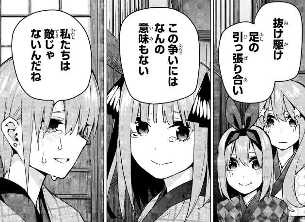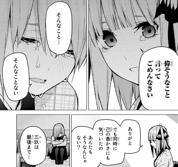 しかし二乃は、三玖が最後まで一花は悪くないと言っていたと言い、姉妹同士での争いに何の意味もない、私たちは敵じゃないんだね、一花も涙ながらに話します。三玖に謝りましょう、きっと前より仲良くなれると笑顔で二乃は一花に語りかけます。