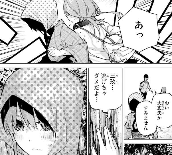 三玖が風太郎から逃げようとしていた時、誰かにぶつかっていましたが正体は一花でした。