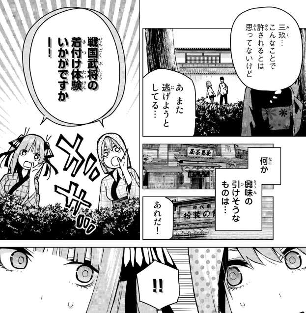 戦国武将の着付け体験を後押しするところでは、何故か二乃までが一緒になって三玖を後押ししています。二乃は一花と同様、二人を見守る為仮病を使って自分の組から抜け出していました。さらに四葉、五月も一花たちと同様、同じような変装をして三玖たちを見守っています。