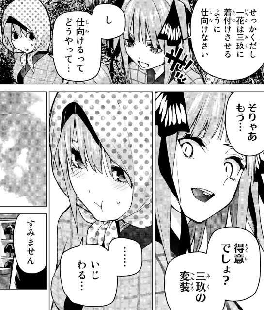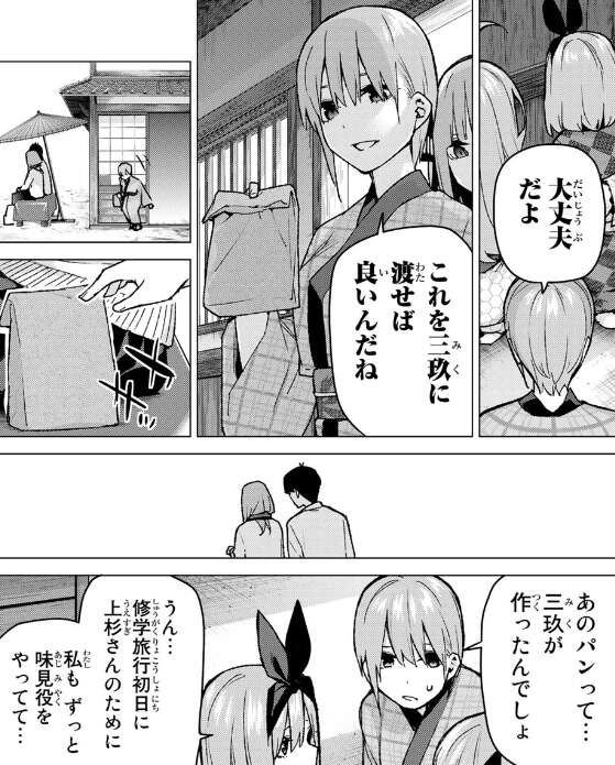 前回、三玖がコース別体験学習で風太郎に無事告白を済ませましたが、今回はその裏であった話です。三玖の元に亡くなったパンの袋が届いたりしていましたが、誰が暗躍していたのかが分かります。