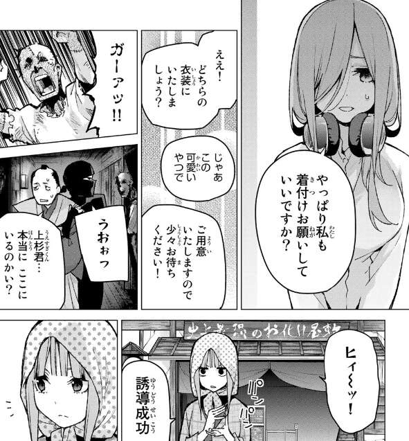 三玖に変装した一花は係の人に着付けをお願いして、用意してもらいます。前回、三玖が着付けをお願いする時に係の人がノリノリだったと言っていたのは、一花が裏で仕組んでいたからでしたね。二乃も前田と武田をお化け屋敷に誘導に成功して、風太郎と三玖から引き離しています。
