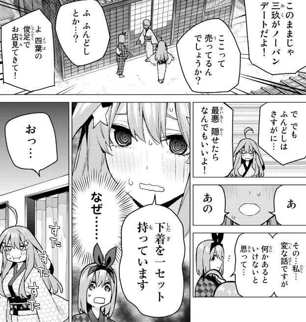 上手く二人きりになった風太郎たちを見て、思わず二乃は風太郎に駆け寄って抱き着いてしまいます。このはずみで三玖は、池に落ちてしまっています。池に落ちた三玖を見て、四葉は三玖の下着の心配を一番に考えますが、代わりの下着がない!一花と四葉で悩んでいると、五月は例の下着1セット持っている事を明かし(四葉驚いてます)、無事更衣室の三玖の所に届けました。