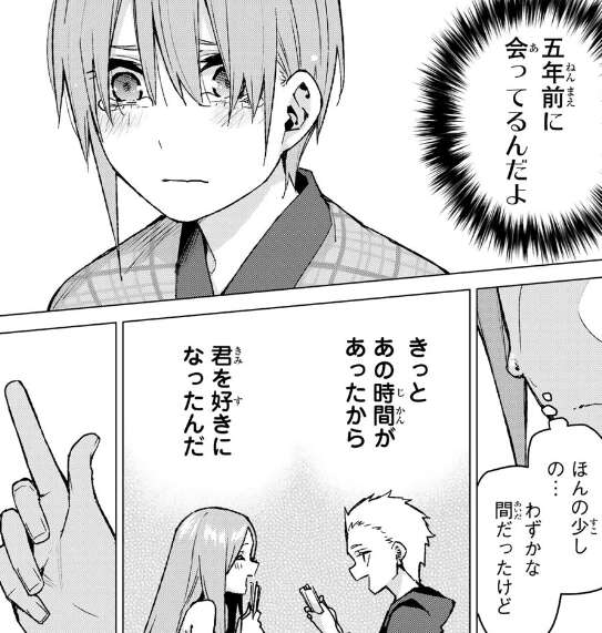 三玖が告白という場面で、一花は心の中で三玖に今まで邪魔してごめんと謝ります。そして風太郎にも嘘ばかりついてと謝りますが、五年前に会っていた話だけは嘘ではなかったようで、五年前大広間でトランプをして遊んだのはどうやら一花のようです。