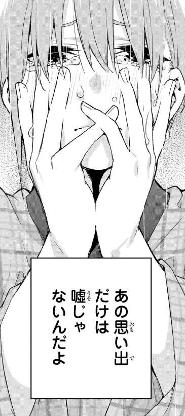 好き、と三玖が告白する場面の裏で、一花は複雑な思いでその場面を見ています。五年前のトランプをする思い出は嘘じゃなかったようで、お守りを一緒に風太郎と買ったのが別の姉妹だったようですね(まだ別の姉妹とは確定してません)、ややこしい!