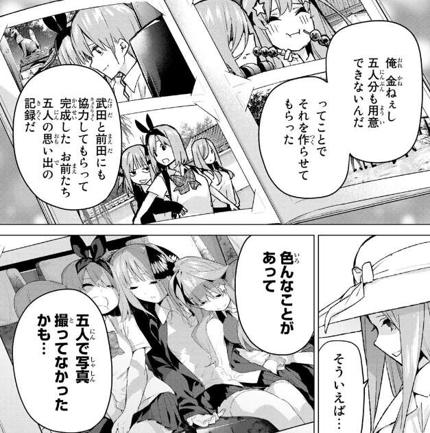 修学旅行が終わり、風太郎は零奈と会い誕生日プレゼントのお返しにアルバムを手渡します。風太郎は五人分の誕生日プレゼントのお返しを用意できるほどお金もないという事で、前田と武田にも協力してもらい五つ子たちの修学旅行の思い出を記録したアルバムを作っていました。零奈も色々あって五人で写真撮っていなかったかもと言います。