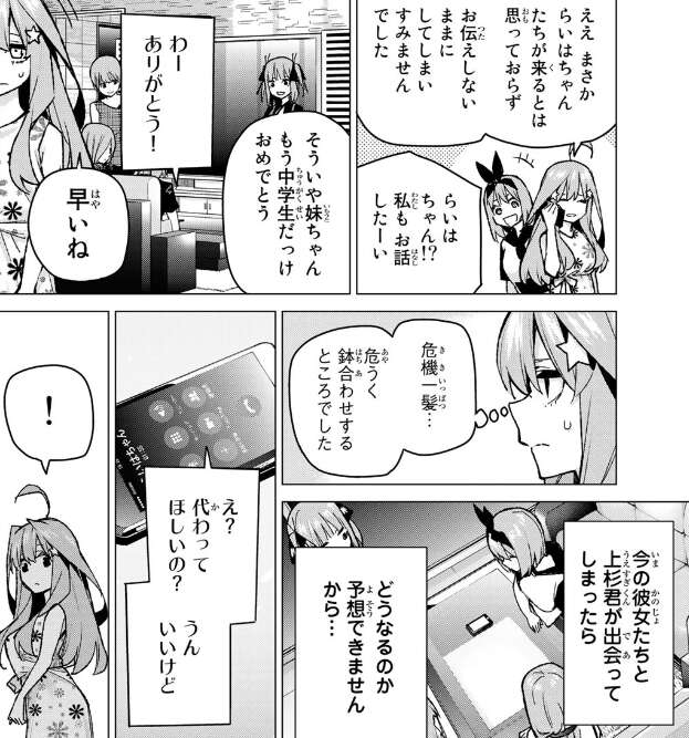 しかし五月は安心したと思ったら、らいはが風太郎と電話を代わり、風太郎本人から驚きの提案を五つ子たちにします。