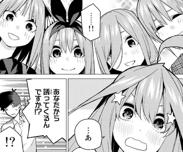風太郎は自分から五つ子たちにプールでも行くか、と誘います。喜ぶ一花たち、そして五月は思わず予想外の風太郎からの誘いに驚いてしまいます。