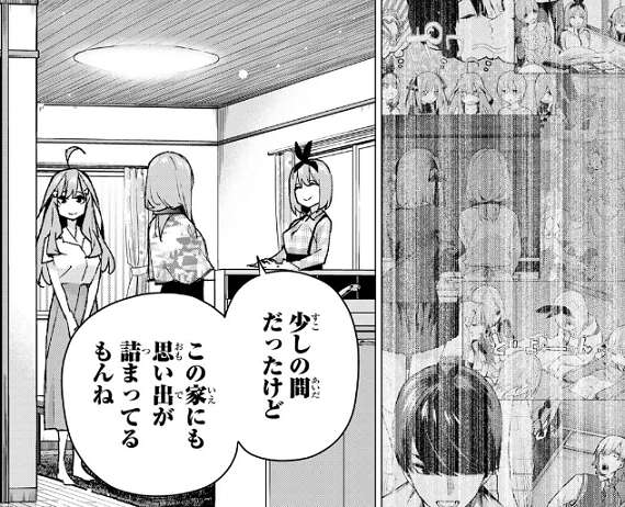 引っ越しには猶予があるとはいえ受験もあるので、夏休み中に引っ越しを済ませてしまうようです。五つ子たちは短い間とはいえこのアパートに詰まった思い出を振り返り、少し寂しい気持ちになります。場面変わってアパートの外で一花は誰かと電話をしていますが一花が電話相手に、自分はいなくなるので妹たち四人でということになります、と話している所を五月は偶然聞いてしまいます。
