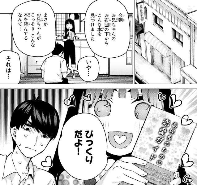 一方、風太郎は布団の下に「高校生のための恋愛ガイド」本を隠しているところを見つかり、妹のらいはに散々いじられます。風太郎は無理矢理友達に貸されただけだと言い訳をしますが、らいははお兄ちゃんに友達なんていないでしょと、言い訳を聞きません。らいはは夏休みに入ってずっと引きこもって勉強をしていたお兄ちゃんを心配していて、来週の日曜に一緒に海に行こうと誘います。風太郎はバイトがあるからとらいはの誘いを断りますが、そこに電話がありバイト先の店長が怪我をしてしまい、少しだけ店を休むことになったと連絡があります。