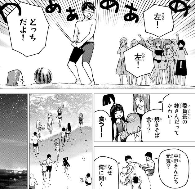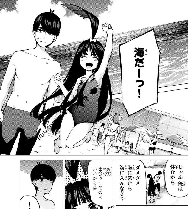 結局らいはに誘われ海に行くことになり、さらにらいはは五月と事前にやり取りをしていて五つ子たちが今日海に来ることも知っています。中学生になったらいはは少しマセていて、風太郎には知らせず偶然出会うのもいいと考えます。そして風太郎は海で知り合いを見つけます。