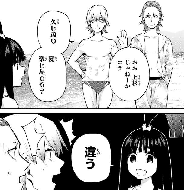 その頃、風太郎はクラスメイトとスイカ割りを楽しみながら海を満喫していました。クラスメイトの女子からは風太郎も楽しそうにしていたと言われ、思わず聞き返します。武田からは風太郎が自分からクラスに馴染もうとしているのは意外だ、1年の頃と比べると驚きの変貌ぶりだが、誰がそうしたのか聞くまでもないと言われます。
