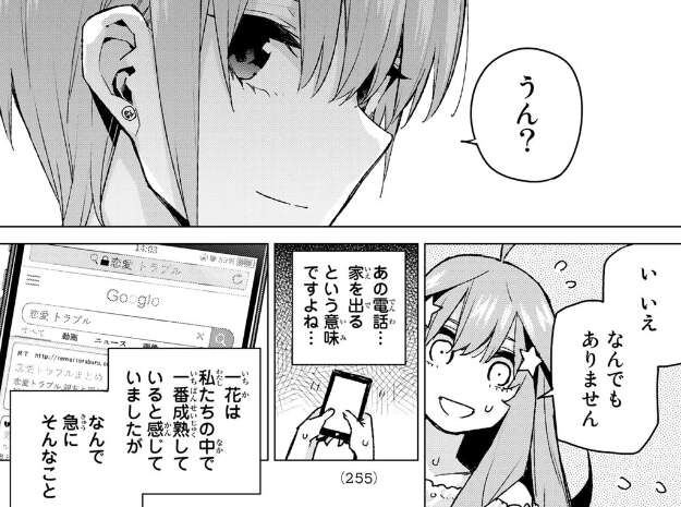 さらに五月は、一花だけなく他の三人も修学旅行が終わってどこか変と感じているのか、今風太郎にこの四人が会うのはトラブルの元だと考えます。五月は風太郎にはせめて夏休みの間は会うのを控えるように、二乃と三玖に注意します。二乃はお構いなしに電話しますが、風太郎には繋がりません。思わず三玖はフータローに会いたいなと呟きます。