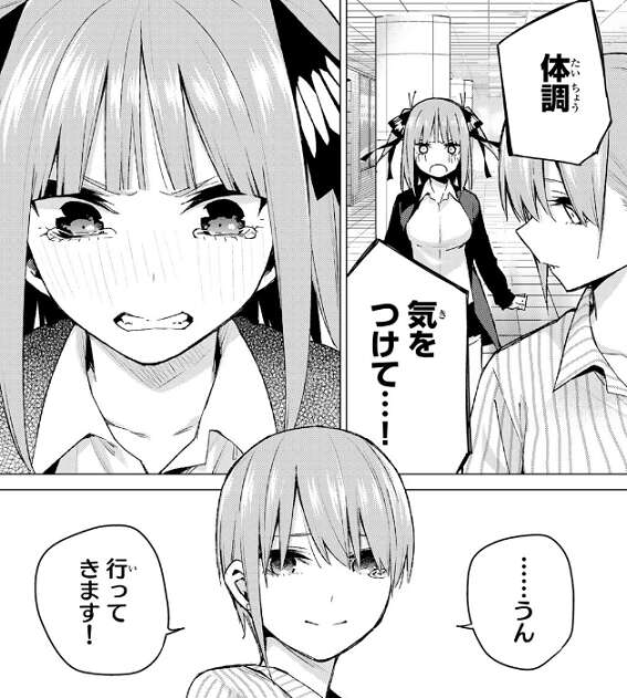 二乃は泣きそうになりながら一花を大声で見送り、一花も同じく涙を浮かべて行ってきます!と言い、仕事に向かいます。一花は休学となり少しずつ生活が変わり、五つ子たちが一緒にいられるのもあと少し、卒業はもうすぐそこまで迫っています。