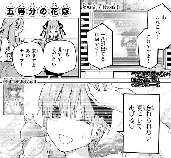 二乃と五月が家でテレビを見ていると、一花が出演しているCMが流れます。冷静な二乃に比べて、五月はテレビに映っている一花に興奮します。テレビや映画の中の一花は輝いていて、本当にやりたいことをやっているんだと五月は思えるそうです。