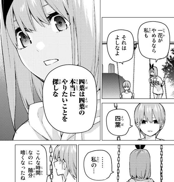 一花はこれから会えることも少なくなってくるだろうから、四葉に言っておきたかったと公園に呼んだ理由を話します。四葉は一花が本当に学校を辞めるのか、私も学校を辞めると四葉は言いかけますが、四葉は四葉の本当にやりたいことを捜しなと一花は言い、一緒に学校を止めないように言います。二人が話していると既に辺りは暗くなっていて、夏の終わりを感じます。