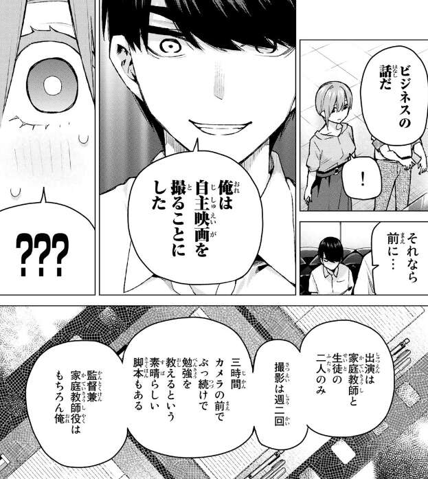 そして風太郎は三玖と一緒に、一花の事務所を訪れます。事務所で風太郎は一花に再び退学を考え直して欲しいと言いますが、社長から今まで通り学校に通いながらは不可能だと断言し、何より一花が決めたことを尊重したいと社長から言われます。そう社長から言われて簡単に諦めたと引き下がる風太郎は、自主映画を撮ることにしたとビジネスの話を始めます。自主映画は、家庭教師と生徒が三時間カメラの前でひたすら勉強をするというもので、家庭教師を風太郎が、生徒役を一花にお願いしたいと言い、お金も貯めてきたと言います。