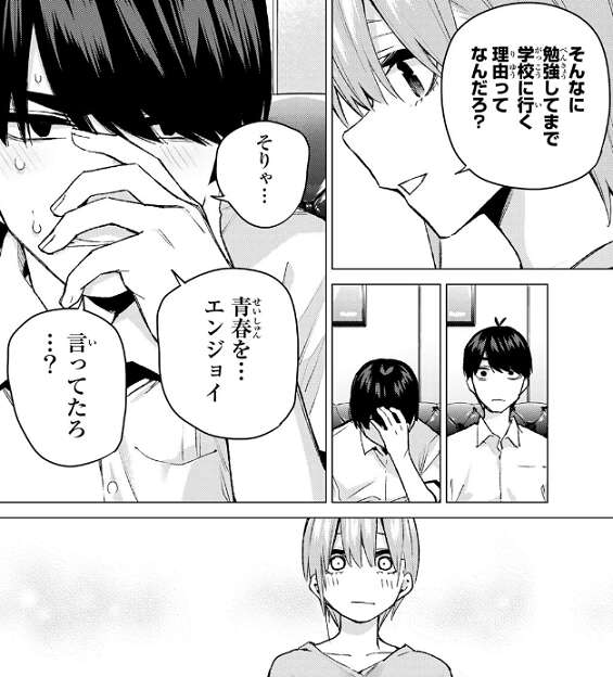 一花は風太郎にこのままお仕事に専念も悪くないと思っているのに、あとたった半年風太郎に迷惑をかけてまで学校に行く理由は何と聞くと、風太郎は青春をエンジョイする事だと言います。風太郎は夏にクラスメイトと海に行った時の思い出を話し、あんな今しかできない事を一花も含めたお前たち五つ子たちとしたいと思ったと言います。