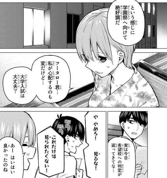 学校から帰宅後、一花の勉強を見ている風太郎ですが、学園祭の準備の話を聞いて一花は大学入試の方は大丈夫かと不安になります。しかし、風太郎の希望校への入試判定は「A」で問題なさそうですが、そんな芸当が出来るのは元々勉強が出来る風太郎だけだと一花は言います。