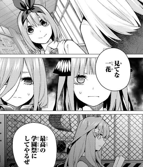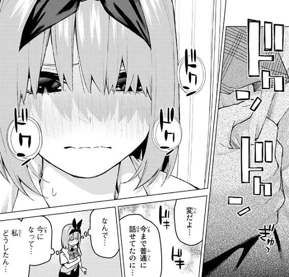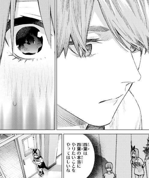 教室から離れて落ち着こうとしますが、胸の鼓動が収まらず四葉は今までは普通に話せていたのに、今になってと自分に驚きます。そこに風太郎が四葉を追いかけてきて、学園祭の屋台の事を切り出していきます。四葉は勉強で時間を無駄にできないのではと気を遣いますが、風太郎は最後の学校行事だからこそ無駄にできない、やるからには徹底的に楽しむと言います。風太郎はまずは去年の屋台のデータを聞き込みに行くと言い、四葉にも頼りにしていると言うと四葉は嬉しそうに任せて下さいと返事をします。