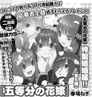 来週の8月7日は「五等分の花嫁」連載開始2周年!という事で、巻頭カラーだそうです。2周年記念で、プレゼント企画もあるようでぜひチェックしてみて下さい。