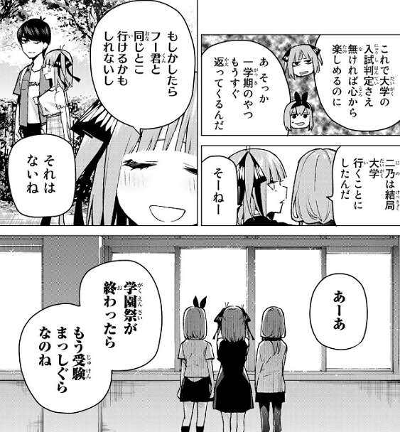 五つ子たちは2年の時は転入してすぐだったので、3年の今回は準備にも参加できてうれしそうです。これで大学の入試判定の結果が返ってこなければと、二乃は愚痴を言い風太郎と同じ大学に行く妄想をしますが、即座に否定されます。そして学園祭が終われば、いよいよ本格的に受験に突入かと呟きます。