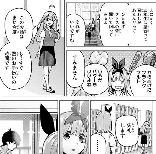 その時四葉が先生から職員室まで呼ばれて、学園祭について学級委員長を中心にいろいろ決めてくれと頼まれます。その後職員室から出ると、ちょうど授業で分からない箇所があり質問に来ていた五月と出くわします。五月に三年は食べ物の屋台をやるのが習わしらしいと、学園祭でやる屋台の話を四葉は振りますが五月は珍しく食べ物の話に食いつきません。