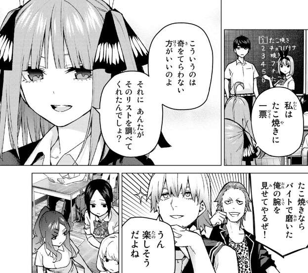 風太郎と一緒に去年人気だった屋台メニューを調べ、四葉はクラスメイトの意見を聞きます。二乃、前田、武田はたこ焼きが良いと言い、他のクラスメイトもそれぞれ自分の意見を言います。