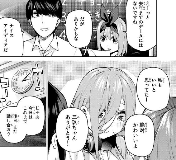風太郎は黙っていた三玖に何かやりたい食べ物を聞くと、バイト先で上手く作れるようになったであろう、パンケーキをあげます。これが女子を中心にかわいいと好評で、意見を出した三玖は恥ずかしそうに顔を赤らめます。