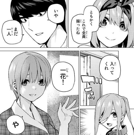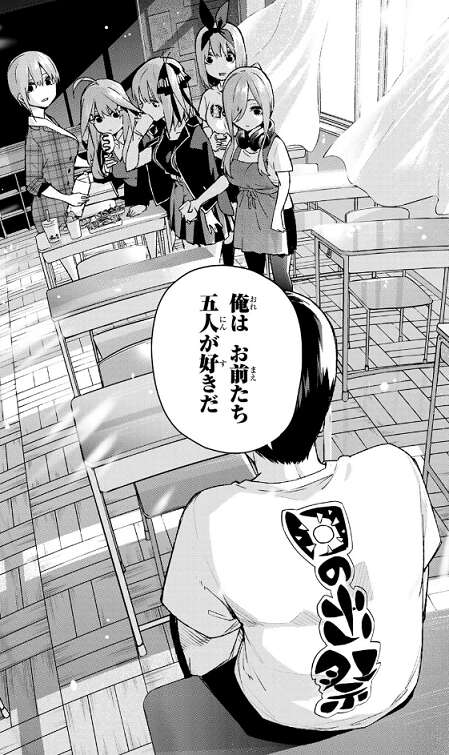 その時唐突に風太郎が、お前たち五人が好きだと告白してきます。びっくりする五つ子たちですが、風太郎はこの六人でずっと、このままの関係でいられたらと願っていると言いますが、答えを出さなければいけないと思うと、風太郎は答えを出す決断したようです。