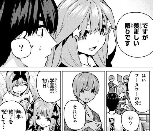 五月に羨ましい限りです、と言われてもピンときていない風太郎ですが、それはともかく六人は学園祭初日が、無事終了したことを祝して乾杯します。