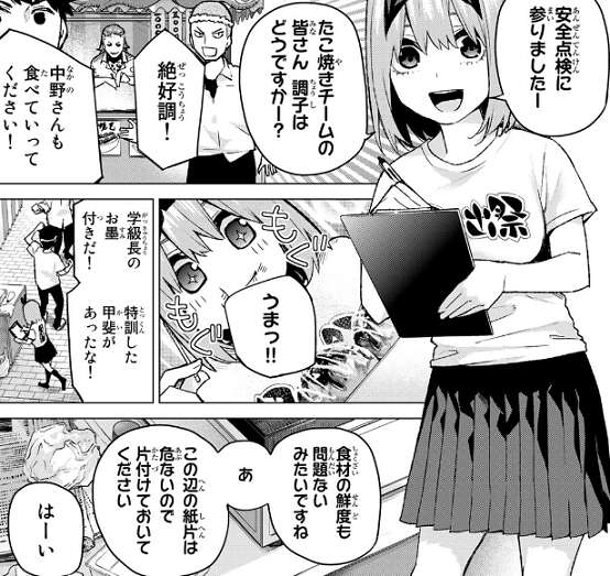 一方、二乃は女子生徒ユニットの一員として、オープニングダンスに参加しており、本人は大分嫌がっていますが、オープニングダンスは大人気です。そして学園祭開幕ですが、風太郎と五つ子たちのクラスはパンケーキとたこ焼きの屋台をしており、三玖はパンケーキの焼き方をクラスメイトの女子に指導してます。バイト先で教わった方法は、クラスメイトにも好評ですが、15時までに屋台をぬけて教室行けるか微妙です。