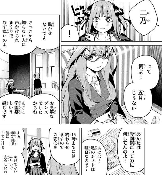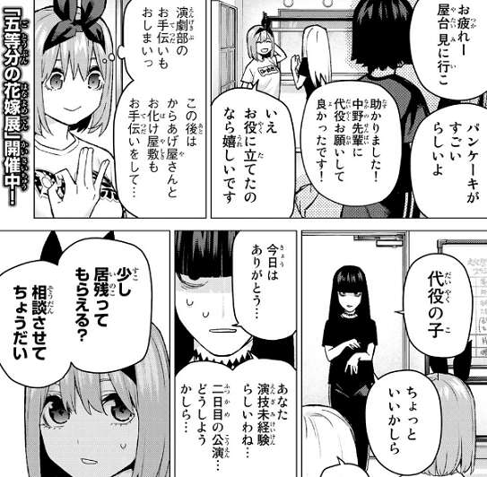 仕方なくたこ焼き屋の屋台の様子を見るのは諦めて、学校内を歩いていると勉強をしている五月に声をかけられます。五月は初日に出番はないようで、学園祭の最中ですが勉強をしていて、二乃から学園祭だってのに何してんのよ…っと突っ込まれます。