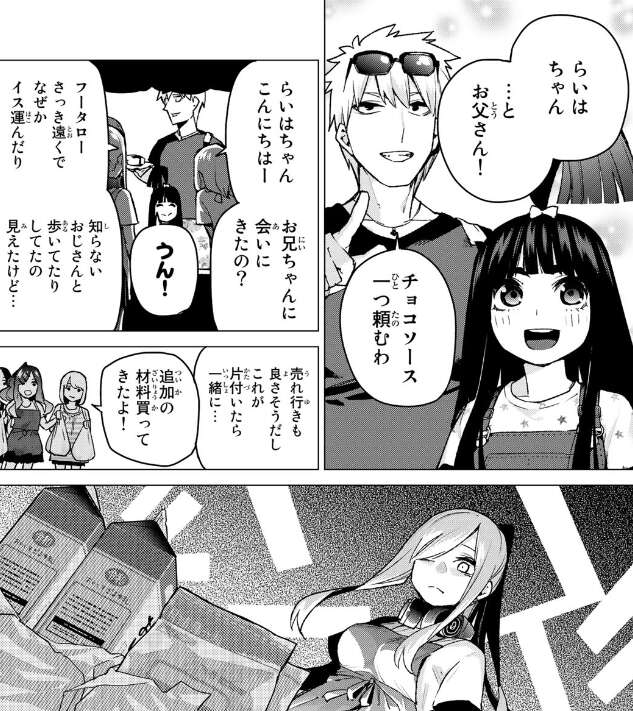 再び三玖ですが、パンケーキの屋台にらいはと父親が訪れて三玖が作ったパンケーキを食べています。三玖は一段落ついたら、らいは達と一緒に歩いて回りたかったようですが、追加の材料が到着し、屋台をぬけることが出来ません。15時までに教室に行くのは無理かも、と本気で困っています。